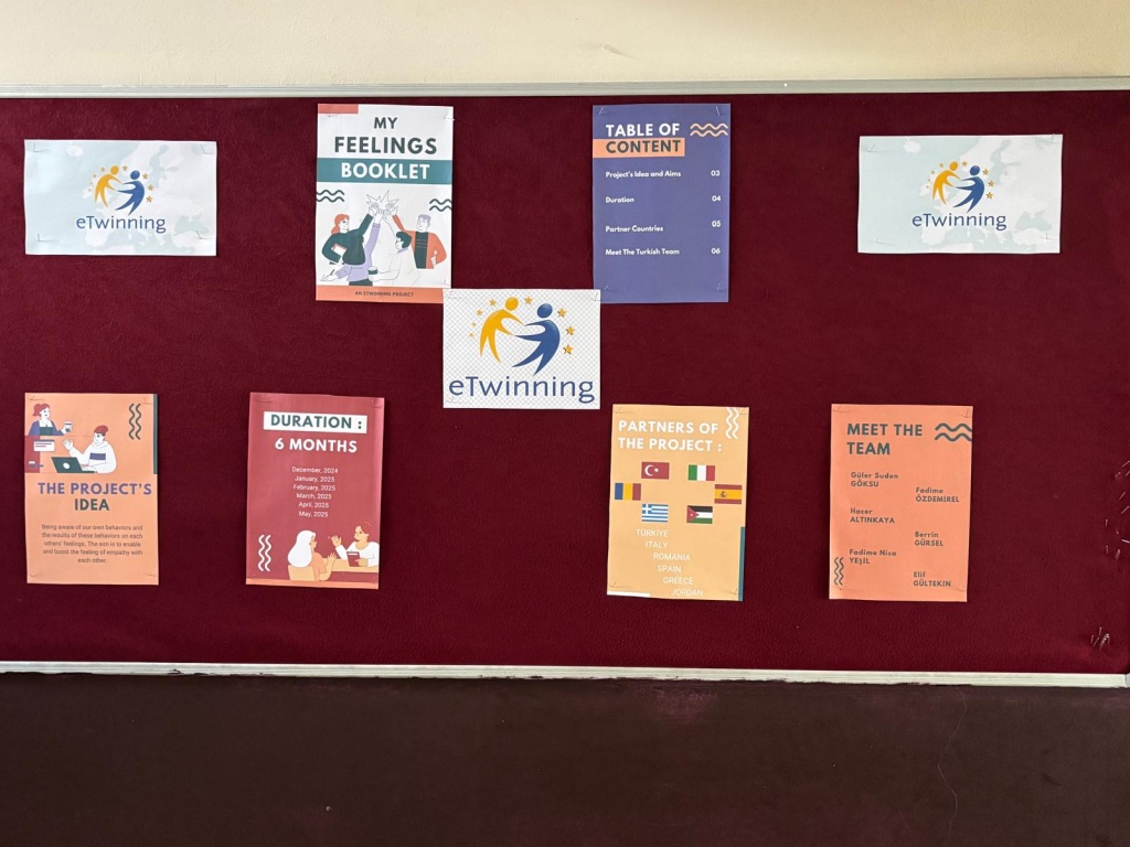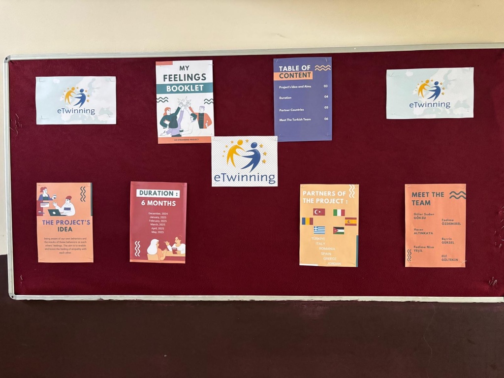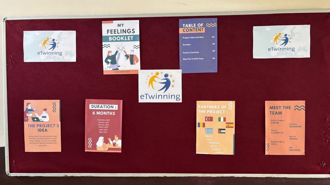 Okulumuz İngilizce öğretmeni Senem DEMİR tarafında proje kuruculuğu yapılan ve İtalya kurucu ortağımızla oluşturulan “MY FEELINGS BOOKLET” isimli E-Twinning projemiz Ocak ayı itibariyle etkinliklere başladı. Projede "Benim Duygularım Kitapçığı" temalı etkinlikler gerçekleştirilecek ve Türkiye, İtalya, İspanya, Romanya, Yunanistan ve Ürdün olmak üzere 6 ülke yer almaktadır. İçeriğinde ise öğrencilerimizin okul içerisinde yaşadığı duydu durumları işlenecek olup birbirleriyle iletişimin önemi üzerinde durulacaktır. Kuruculuğunu yaptığımız projemiz, bu noktada farkındalık yaratmayı ve öğrencilerimizin okul ortamında ve bireysel hayatlarında “iyilik” halini güçlendirmeyi hedeflemektedir. İlk çalışmamız ise öğrencilerimiz tarafından hazırlananprojenin amaçları ve süreçler hakkında bilgilendirme içeren okul E-Twinning panosu oldu.