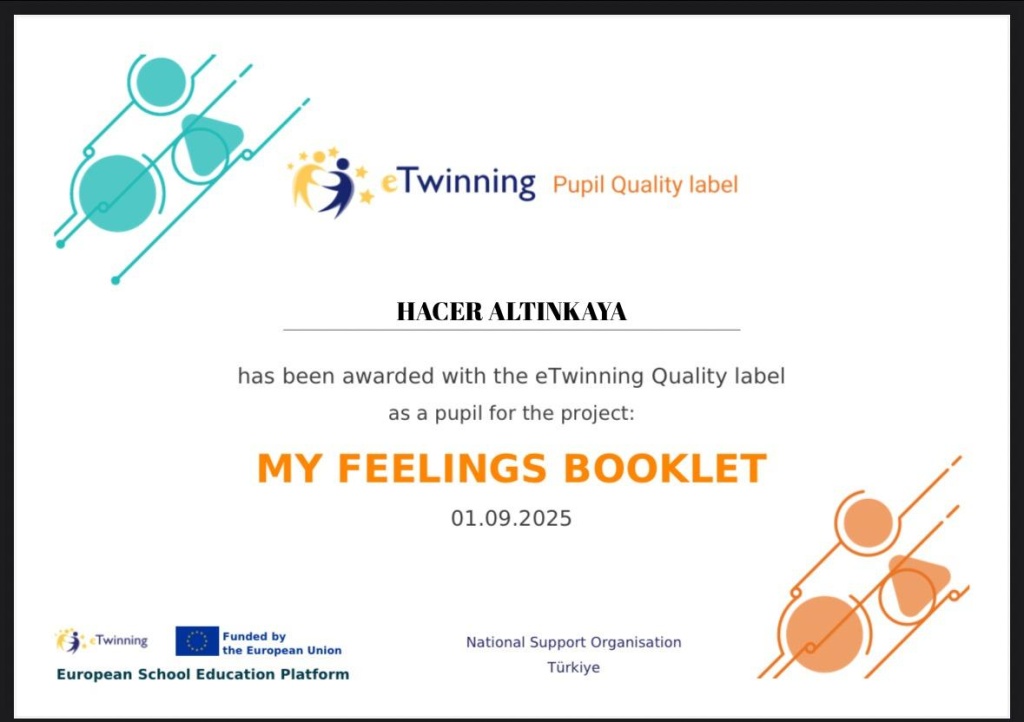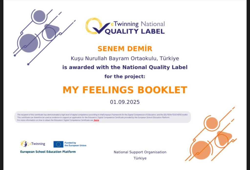 Yeni eğitim-öğretim yılına güzel bir başlangıç yaptık. İngilizce öğretmenimiz Senem DEMİR’in proje kurucusu olduğu eTwinning projesi MY FEELINGS BOOKLET 2025 yılı ULUSAL KALİTE ETİKETİ almaya hak kazandı. Öğrencilerimizin yaşadığı duyguları anlamlandırma ve bu duygularda birbirleriyle iletişimin önemini ön plana çıkaran bu proje için öğretmenimizi, öğrencilerimizi ve tüm ortakları kutluyoruz.